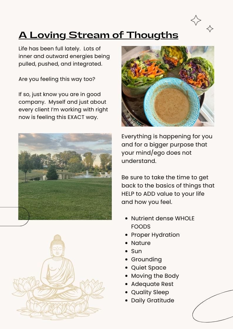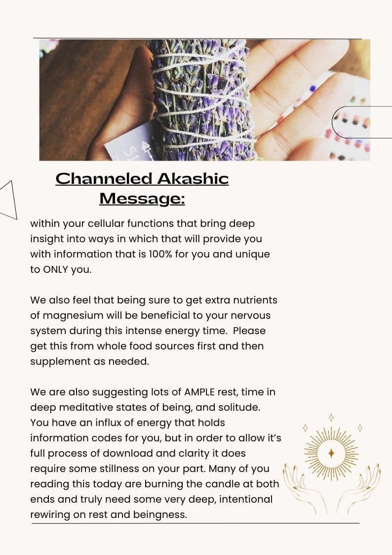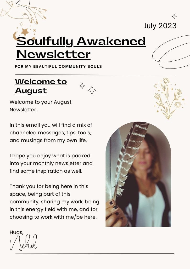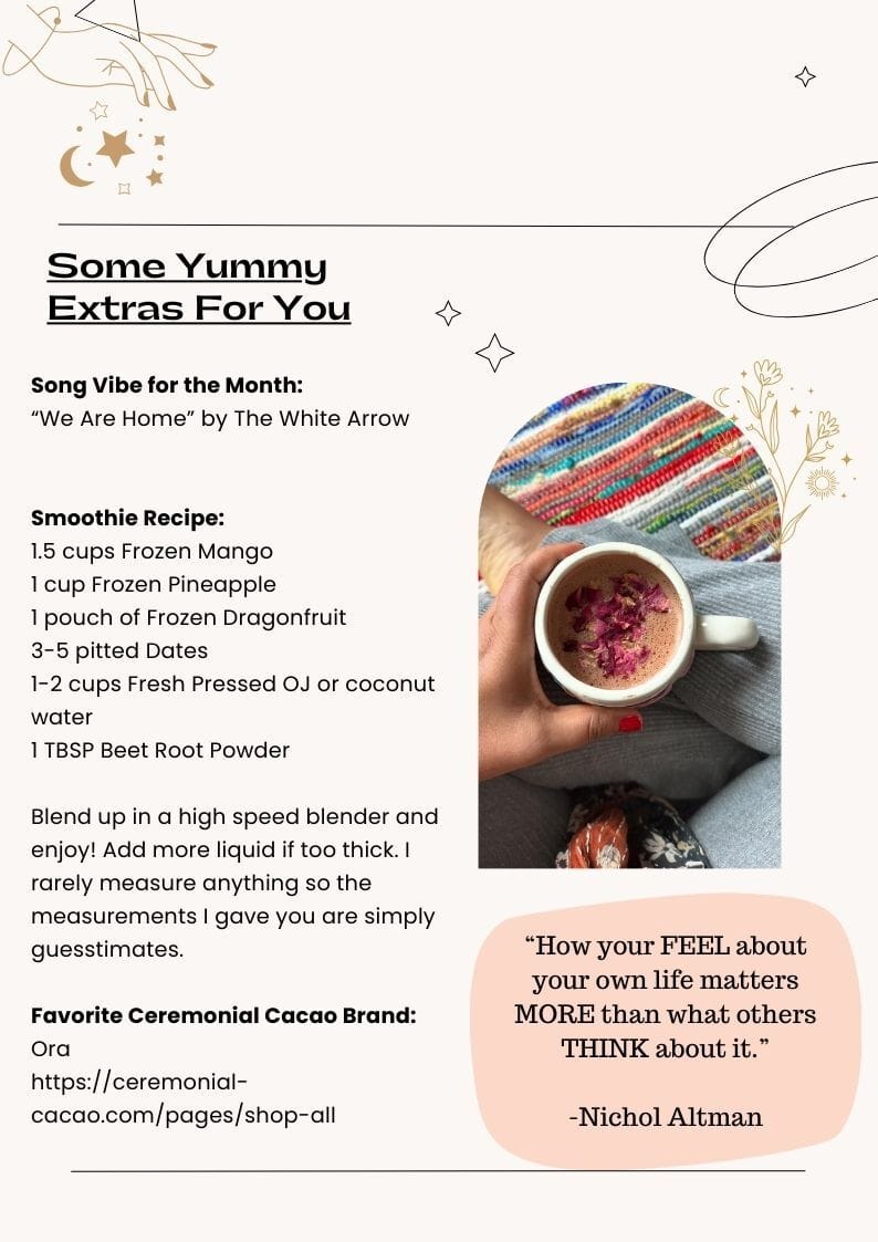 Monthly teaching via audio, a new guided meditation each month, weekly journal prompts, pop up channeled guidance, energy updates, and soon to come…..live group healing/coaching sessions.