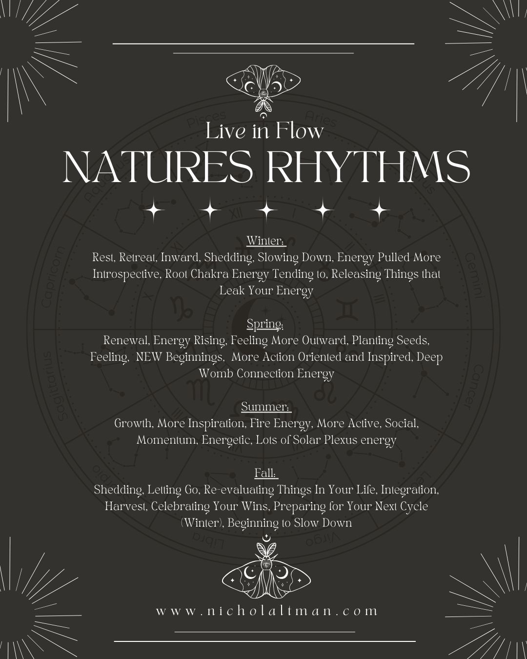 In my personal experience it makes so much more sense to flow with each natural cycle of the natural living world around me. The 4 seasons aren’t just so we can watch the world outside of window change and shapeshift. It’s also a guidebook for you on how to LIVE your life.